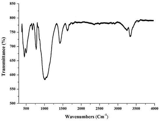 The bands present in raw BNTN are seen at 3401, 1643, 1489, 1028, 793, 690, and 520 cm−1, as depicted in Figure 3. The broadband visible at 3401 cm−1 is accorded to the hydrogen bonds of the water molecules adsorbed onto the interlayer of the BNTN. The band observed at 1643 cm−1 is due to the flexural vibrations of the water molecules adsorbed onto the BNTN. The peak seen at 1439 cm−1 is caused by the bending vibrations of the C-H bonds. Further, the infrared spectrum in the BNTN shows a band at 1028 cm−1, apparently due to the bending vibrations of the Si-O-Si. The quartz bands (Si-O) show proximity to 790 cm−1. The band identified at 520 cm−1 is related to the bending vibrations of the O-Si-O. The 690 cm−1 band is also ascribed to the Al (Mg) -Si-O tetrahedral. The remaining peaks are evident from 500 to 1000 cm−1; however, they are likely produced by the functional groups, Fe-O-OH and Fe-O. In addition, the bands present at 850, 1350, 1700, and 2900 cm−1 can also be related to the zinc oxide functional groups.