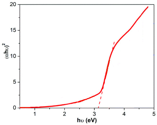 The optical properties of the composite employed in this work were subjected to DRS analysis for evaluation, as shown in Figure 4. Based on prior studies, the band gap was around 3.2 electron volts; however, from this analysis, the presence of other materials, suc as BNTN and iron oxide, induced a slight alteration in the zinc oxide band, and the value is now 3.1 electron volts.