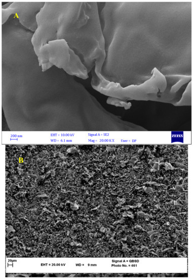 From Figure 5, the FESEM images of the BNTN, BNTN@Fe3O4, and BNTN@Fe3O4@ZnO particles are clear. Based on Figure 5A, the BNTN appears bulky, with a massive morphology and irregular flakes; the surface appears smooth, as is evident from Figure 5. In addition, Figure 5B indicates that the iron particles are seated well and quite evenly on the BNTN. The final BNTN@Fe3O4@ZnO composite can be seen in Figure 5C. Obviously, the zinc oxide particles present on the magnetic BNTN are deposited in a layer that is thin and compacted.