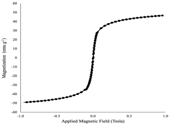 Depending upon the magnetization curve, it is evident that this material is super-magnetic, with a magnetic saturation of approximately 50. Thus, the conclusion is drawn that when the final nanocomposite employed in this work is dispersed in water, it can easily and quickly be gathered using an external magnetic field, and it is also easily dispersed in the solution via slight shaking.