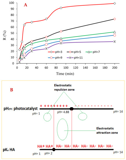 In this work, an investigation into the photocatalytic degradation of HA at various pH values (i.e., 3–11) was carried out, and the results are displayed in Figure 7A. At pH values of 3 and 11, the findings reveal the most and least HA degradation efficiency levels, respectively, which are to be expected. The reasons for these results are that in a homogeneous photocatalytic degradation reactor, two eminent oxidizing species are present: the hydroxyl radical: (●OH) and positive electronic holes: (h+). The high potential can easily degrade the organic pollutants in the reactor. While the ●OH can exist throughout the reactor randomly when it is generated in large quantities, the h+ is present only on the surface of the photocatalyst. Therefore, wherever both the h+ and ●OH are present at the same time, the degradation efficiency will be high, and the contaminants will be removed. This simply means the photocatalyst surface attracts the negative HA ions onto its outer surface due to the electrostatic attraction between them, resulting in HA degradation through the active h+. These conditions prevail when the medium demonstrates an acidic pH (below 4.88). Simultaneously, the HA is eliminated by the ●OH and h+, and Figure 7A indicates that it is at a pH if 3 that the highest yield of degradation occurs. In Figure 7B, a graphical schematic representation is shown for a clearer understanding of this process. Other researchers have reported similar findings that correspond to the results of the current study [38].