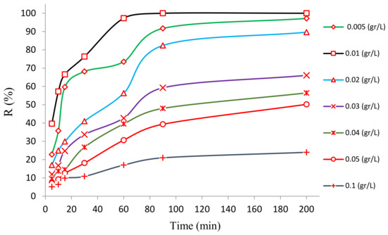 The variable next in significance that affects the photocatalytic reaction is the dose of the photocatalyst synthesized, which influences the percent of contaminant degraded. Therefore, it is crucial to determine the optimal value of the dose for practical purposes. To study the effect of the dose of the synthesized photocatalyst on the process of the photocatalytic degradation of HA, several doses of the bentonite@Fe3O4@ZnO magnetic nanocomposite (from 0.005 to 0.1 g/L) were experimented with under a variety of conditions (i.e., pH = 3; HA concentration = 10 mg/L; UV lamp (16-watt power)). The findings are listed in Figure 8. From this figure, the inference can be drawn that the greatest and least efficiencies were observed for the photocatalyst doses of 0.01 and 0.1 g/L, respectively. Initially, the efficiency escalated when the dose was increased from 0.005 to 0.01 g/L; however, any further increase in the dosage exceeding 0.01 g/L caused the efficiency to drop, so the lowest efficiency was observed at the highest dose of 0.1 g/L.