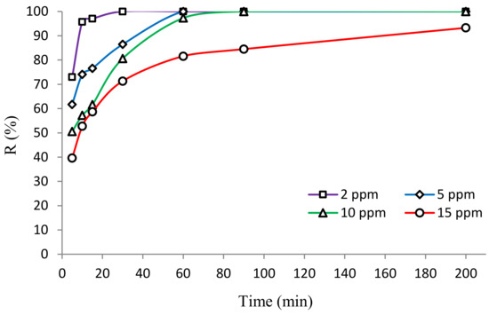 Another variable that influences the photocatalytic degradation of organic contaminants is the concentration of the pollutant present in the aqueous solution [40]. From the photocatalytic reactions, it is evident that greater removal efficiency is achieved when the concentration of the contaminant is reduced. However, determining the maximum concentration that can be completely removed is proving to be a major problem. Therefore, the removal of HA through photocatalysis was investigated at different concentrations of HA (i.e., 2, 5, 10, and 15 mg/L), and the results are revealed in Figure 9. According to the results, the photocatalytic process using BNTN@Fe3O4@ZnO demonstrated the ability to completely degrade the HA when it was present in concentrations of 2, 5, and 10 mg/L within 30, 60, and 70 min, respectively; however, at a concentration of 15 mg/L, approximately 7% of the humic acid was still present in the reactor even after 200 min of contact time during photocatalysis. The improvement in the degradation of HA is attributed to the reduction in its initial concentration. This is because under identical conditions (i.e., pH, BNTN@Fe3O4@ZnO dose, and reaction time), the elimination of HA by the ●OH increases when its value is lower. Further, at a higher dose of HA, the photocatalyst surface area available for the UV absorption and the occurrence of photocatalytic actions are decreased because of the greater adhesion of the HA to the BNTN@Fe3O4@ZnO surface sites.