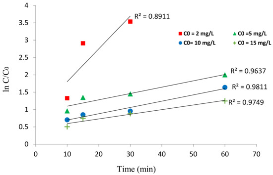 While modeling empirical data in advanced oxidation processes such as photocatalysis, the rate of organic substance oxidation must be studied, and the performance of the photocatalyst must be ascertained [41]. In the photocatalytic unit using the BNTN@Fe3O4@ZnO magnetic nanocomposite, the kinetics of HA oxidation under UV irradiation was investigated by the first-order kinetic model (using a linear plot to determine the k and integrated rate law). In Table 2, the findings of the linear analysis and the empirical HA removal data are shown. The constant rate of the reaction kinetics, Kobs, is obtained by plotting the linear chart of lnC/Co versus time (Figure 10). In addition, to model the reaction kinetics, the equation of the integrated rate law ( was applied to estimate the residual HA concentration values over time t. Then, a graph was plotted of the predicted versus experimental values, and the degree of their relationship was ascertained via the determination coefficient (R2) [42,43]. Finally, using the Solver plugin in Excel, the best constant value of the reaction rate was fitted, as shown in Figure 11. The results provided in Table 2 and Figure 10 reveal that the Kobs values decrease as the HA concentrations increase so that their values were 0.2207 and 0.0155 min−1 at HA concentrations of 2 and 15 mg/L, respectively. This suggests that rate of HA degradation was lowered as its concentration increased.