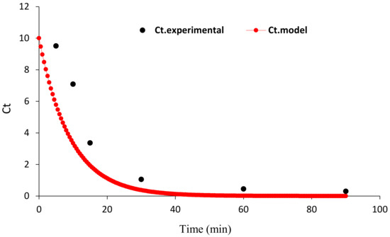 As seen in Figure 11, the R2 value obtained when modeling the kinetics of HA decomposition was high (0.97), and satisfactory compliance is observed between the empirical data and the values predicted by the Langmuir–Hinshelwood model, indicating that the HA degradation data follow the first-order kinetic model.