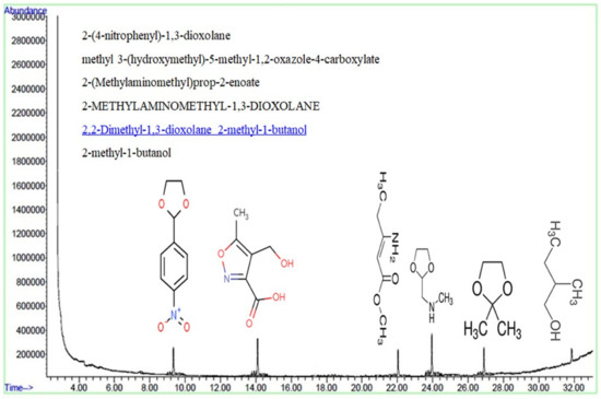 An intermediate compound that could be generated in the process of HA degradation through photocatalysis can be identified using gas chromatography–mass spectrometry (GC). To accomplish this, a GC device was employed to identify all the likely intermediate compounds which can be generated during the photocatalysis process. In Figure 12, the results of the GC analysis are listed. This indicates that 2-(4-nitrophenyl)-1, 3-dioxolane; methyl 3-(hydroxymethyl)-5-methyl-1, 2-oxazole-4-carboxylate; 2-(methylamino methyl) prop-2-enoate; 2-methylamino methyl-1, 3-dioxolane; 2, 2-Dimethyl-1, 3-dioxolane 2-methyl-1-butanol, and 2-methyl-1-butanol compounds are released when the HA is degraded during the photocatalysis process. As is evident from the chemical structure of the byproducts, all the compounds, barring 2-(4-nitrophenyl)-1 and 3-dioxolane, lack the presence of a benzene ring. This implies that the intermediates produced have a simple structure and are biodegradable.