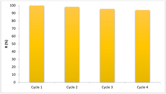 The reusability of the BNTN@Fe3O4@ZnO magnetic nanocomposite in HA degradation was assessed. It was found that 0.01 g/L of nanoparticles was able to be used four times for HA removal when conditions were optimal, and the quantity of non-reduction induced by the destruction of the photocatalyst was regarded as the percentage of reusability.