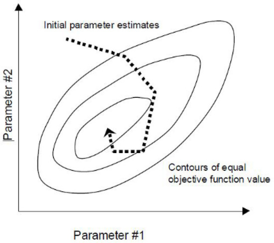 Iterative improvement in initial parameter values toward the global objective function minimum [17].