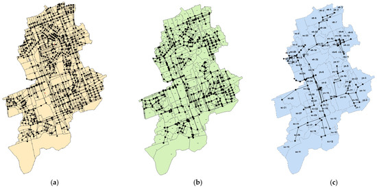 First, by using pipelines of 450 mm or more and a 94% application rate for all of the conduits, topographical data were established; the sub-catchments were composed of 772 and 1062 pipelines, which are shown in Figure 4a. Second, by constructing topographical data and a 63% application rate for all of the conduits using pipelines of 600 mm or more, the sub-region consisted of 310 pipelines and 482 pipelines, which are shown in Figure 4b. Lastly, the construction of topographical data using pipelines of 1200 mm or more and consisting only of mainlines comprised 83 sub-regions and 120 pipelines using a 15.9% application rate for all of the conduits, as shown in Figure 4c.