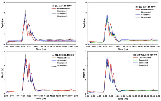 where, is the observed water level, is the simulated water level, N is the number of observed time series, is the observed peak water level, and is the simulated peak water level. When comparing the uncalibrated S1 with the scenario using the automatic calibration method, the RMSE decreased by up to 2.37 cm (S3–S6), and the RPE decreased by 22.04% (S2–S4) (Table 5). When comparing S4, which considers only the parameters with high sensitivity, and S5 and S6, which consider the roughness coefficient of the pervious area with the lowest sensitivity, it was found that the accuracy of S4 is slightly higher. Also, S5 and S6, which included the roughness coefficient of the pervious area, took more calculation time than S4, which did not consider this parameter. A scenario considering the sensitivity of the study area, S4, was shown to be more efficient for real-time modeling, as it can provide flood forecasting and alerts with greater accuracy and a shorter computational time. Table 5 shows the error analysis results compared to the measured water levels for each scenario.
