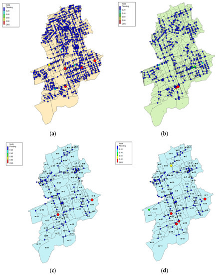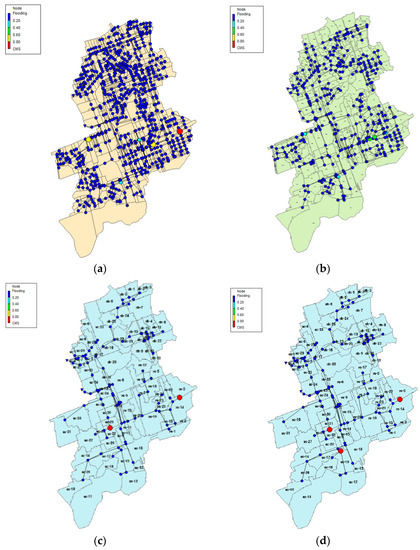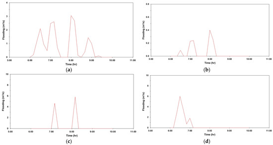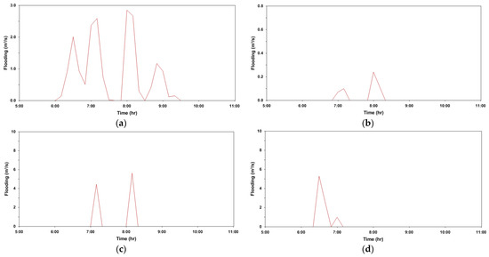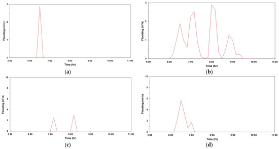 Overflow from manhole for each scenario (22 July 2013. 06:30); (a) S1; (b) S2; (c) S3; (d) S6.