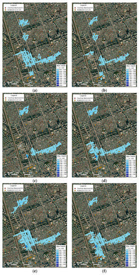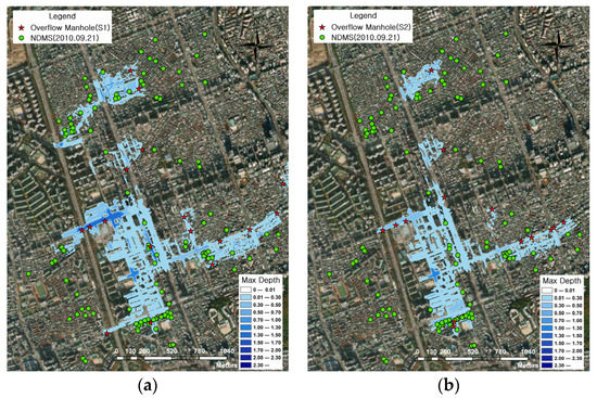 Table 7 shows the goodness of fit between the NDMS points and the predicted flood extent. The flood extent calculated using S6 included 13 NDMS points in the 2013 event and 82 points in the 2010 event. Among scenarios S4 to S6, in which automatic parameter calibration was performed, S6 accurately simulated the manhole overflow location, and thus the fit was the highest, as shown in Table 7. In the nonverified scenarios, namely S1 to S3, overflows occurred at more points in S1, which was divided by the largest number of sub-catchments, than in the other scenarios (S2 and S3), and showed a higher goodness of fit.