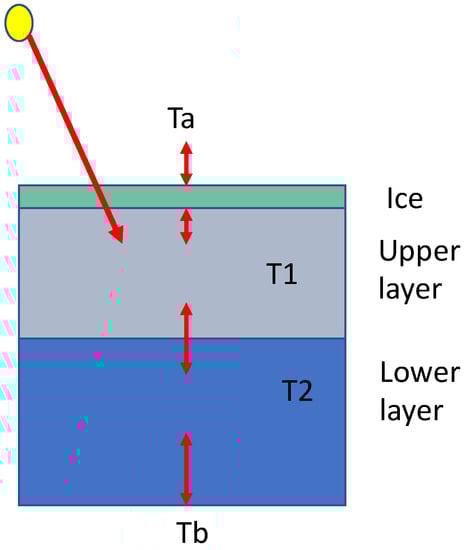 In the presence of ice cover on a lake surface, the surface water temperature is at the freezing point, and ice grows and melts in the interaction with the atmosphere and water body [4,5]. Ice cover is taken here as a rigid, static layer with thickness , specified by its density and thermal conductivity without accounting for the type of ice crystal structure. The approach is feasible when congelation ice is the dominant type. The lower-layer-temperature Equations (2b,f) and stability criterion (2e) apply, and the upper layer temperature and ice thickness are obtained from