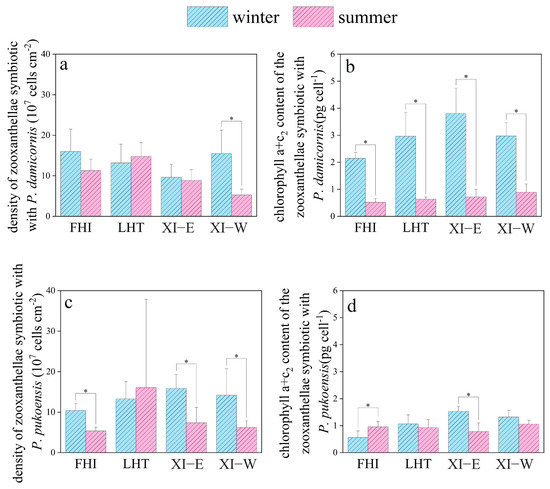 3.2. Winter and Summer Variations in the Density and Chlorophyll a+c2 Content of Symbiotic Zooxanthellae