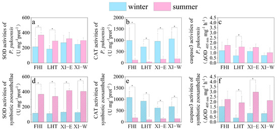 3.3. Variations in Enzyme Activity of P. damicornis and Its Symbiotic Zooxanthellae
