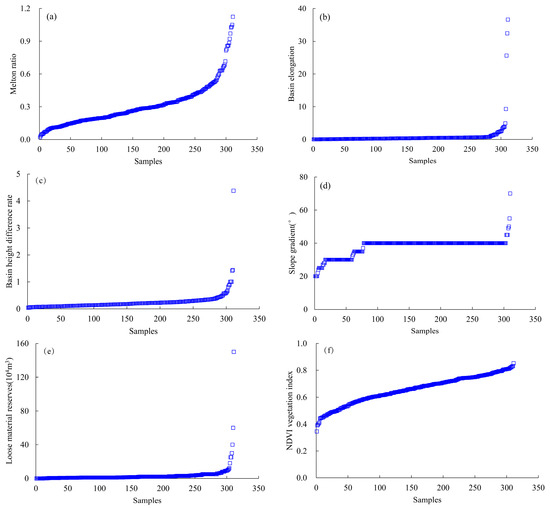 The grading of assessment indicators is directly related to the characteristics of debris flow development, and different debris flow hazard levels correlate to varied grading of evaluation indicators. The statistical theory was used to count 310 debris flows in the study area based on the evaluation indexes on the level of debris flow danger, and the evaluation indexes were fairly graded by combining them with the real evaluation area (Figure 2).