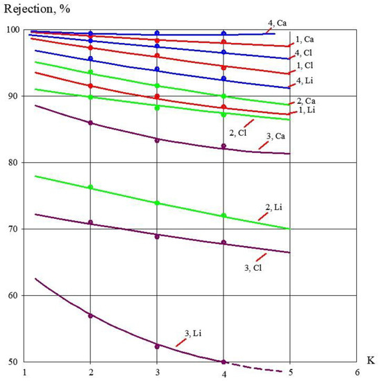 There are a lot of cases where certain monovalent pollutant concentrations (like lithium) can exceed WHO standards by 20–24 times [12,13]. Table 1 shows the groundwater composition in Yakutia. The lithium concentration is 0.48 milligrams per liter. This means that the lithium concentration should be reduced by 24 times to reach drinking water standards. Table 1 shows the results of the treatment of groundwater using different membranes. Rejection values of different ions depending on the initial volume reduction coefficient K value, based on the already published results [14,15], are presented in Figure 1.