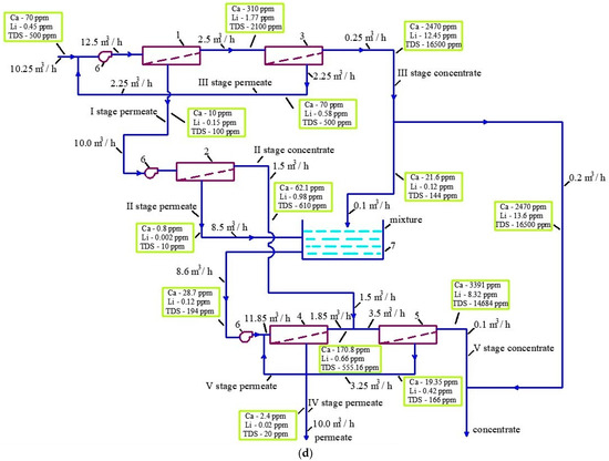 To reduce the concentrate flow rate in all Options, a third stage is applied that uses low-rejection nanofiltration membranes. The permeate of this stage, by its quality, approaches the quality of the feed water and is forwarded to the inlet of the first stage (Options 2, 3, and 4). In options 3 and 4, the concentrate of the second stage is also concentrated by its ionic composition close to the feed water and is also mixed with the feed water at the entrance to stage 1 (Figure 2b,c). In Option 4, we did not direct the second-stage concentrate flow to the entrance of the scheme, as the main goal of this technological approach was to withdraw excessive lithium from the third-stage concentrate. The concentrate of the second stage is further mixed with the concentrate of the fourth stage and enters the fifth stage.