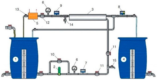 Laboratory test unit flow diagram: 1—source water tank; 2—pump; 3—membrane element in the pressure vessel; 4—filtrate tank; 5—heat exchanger; 6—manometer; 7–9—flow meters; 10—bypass valve; 11—valve for adjusting the flow of source water; 12—valve for adjusting the working pressure and concentrate flow; 13—valve for adjusting the flow of cooling water; 14, 15—samplers.