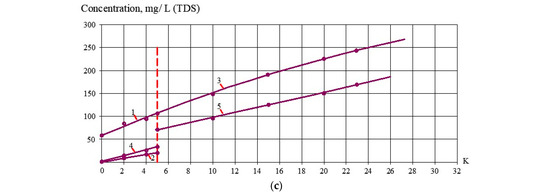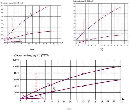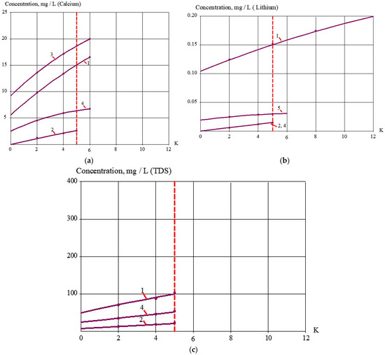 Dependencies of Calcium (a), Lithium (b) and Chloride (c) ion concentration values on K in permeate of 90 NE and 70 NE nanofiltration membranes in different stages of the water flow diagram (Figure 2d): 1—90 NE membranes in the first stage; 2—70 NE membranes in the third stage; 3—70 NE membranes in the second stage); 4, 5—70 NE membranes on the fourth stage. The red line separates processes of drinking water production and concentrate treatment at K = 5.