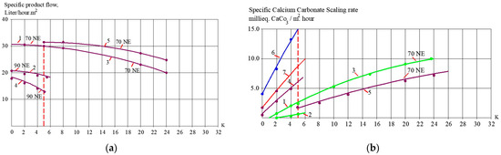 Results of membrane performance observations during the test runs: (a) dependencies of specific product flow rate on K values; (b) dependencies of calcium carbonate scaling rates on K at different stages of membrane modules operation: 1—70 NE membranes, the first stage; 2—70 NE membranes, the second stage; 3—70 NE membranes, the third stage, with antiscalant addition; 4—90 NE membranes, the fourth stage, with antiscalant addition; 5—70NE membranes, the fifth stage, with antiscalant addition; 6—reverse osmosis BLN membranes, first stage, with antiscalant addition; 7—90NE membranes, fourth stage, without antiscalant addition.