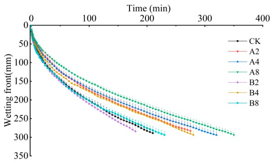 The migration of the wetting front in reclaimed soil with biochar addition is shown in Figure 1. It can be seen from Figure 1 that the wetting front moved quickly in the initial stage and then slowly migrated to stable. In contrast, wetting front migration was only promoted by lower rates of rice husk biochar treatment (B2). When the wetting front reached 300 mm (bottom of soil column), the duration of water infiltration was 228 min for CK. Compared to CK, the duration under A2, A4, A8 was increased by 35.0%, 46.0% and 59.1%, respectively.