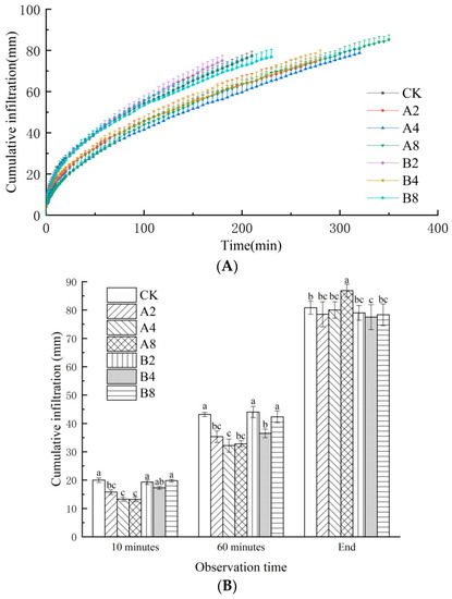 (A) The cumulative infiltration dynamics under different biochar varieties and addition rates. (B) The specific cumulative infiltration at different infiltration times. Notes: The different lowercase letters on each set of columns indicate significant differences at this time (p < 0.05).