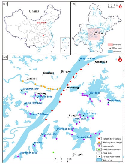 (a) Location of the Wuhan; (b) Location of the study area; (c) Distribution of sampling points of surface water bodies in Wuhan.