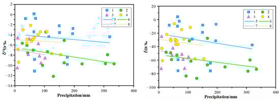 The relationship between δ18O/δD values and seasonal precipitation in the Wuhan area: 1—the value of δ18O/δD and precipitation in spring; 2—the value of δ18O/δD and precipitation in summer; 3—the value of δ18O/δD and precipitation in autumn; 4—the value of δ18O/δD and precipitation in winter; 5—the relationship curve between δ18O/δD and precipitation in spring; 6—the relationship curve between δ18O/δD and precipitation in summer; 7—the relationship curve between δ18O/δD and precipitation in autumn; 8—the relationship between δ18O/δD and precipitation in winter.