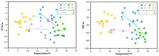 The relationship between δ18O/δD values and seasonal temperature in the Wuhan area: 1—the value of δ18O/δD and temperature in spring; 2—the value of δ18O/δD and temperature in summer; 3—the value of δ18O/δD and temperature in autumn; 4—the value of δ18O/δD and temperature in winter; 5—the relationship between δ18O/δD and temperature in spring; 6—the relationship between δ18O/δD and temperature in summer; 7—the relationship between δ18O/δD and temperature in autumn; 8—the relationship between δ18O/δD and temperature in winter.