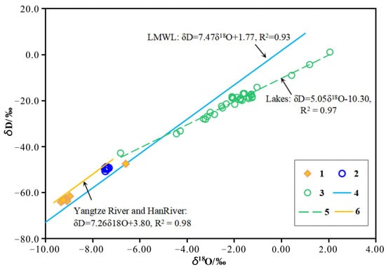 Relationships between δ18O and δD of the Yangtze River, Han River, and lakes in Wuhan: 1—Yangtze River water; 2—Hanjiang River Water; 3—lake water; 4—LMWL; 5—lake water line; 6—river water line.