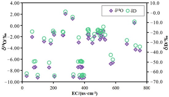 In water, δD and δ18O are stable isotopes of water molecules. When the hydrogen and oxygen isotope composition of a water body is significantly correlated with ion concentration and mineralization, the water body is subjected to evaporation to cause hydrogen and oxygen isotope fractionation, which makes the hydrogen and oxygen isotopes heavier, and the corresponding ion concentration and salinity also increase []. When the hydrogen and oxygen isotope composition has no significant correlation with the ion mass concentration and salinity, a water body is mainly affected by the recharge source []. Therefore, combined with the field test data of lake water, the correlation between hydrogen and oxygen isotope content and electrical conductivity (EC) in all lakes was analyzed (Figure 6).