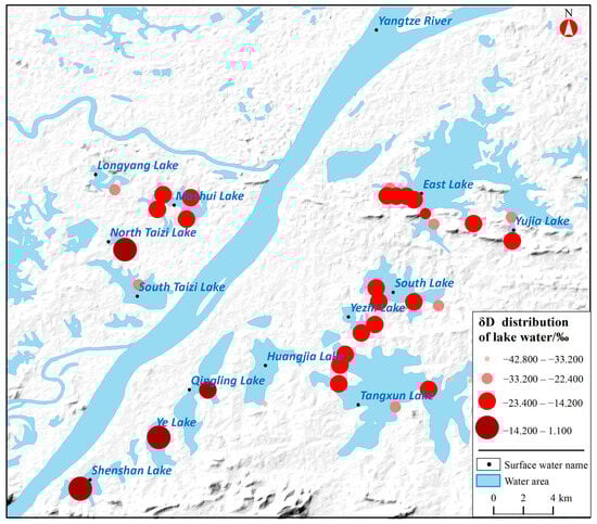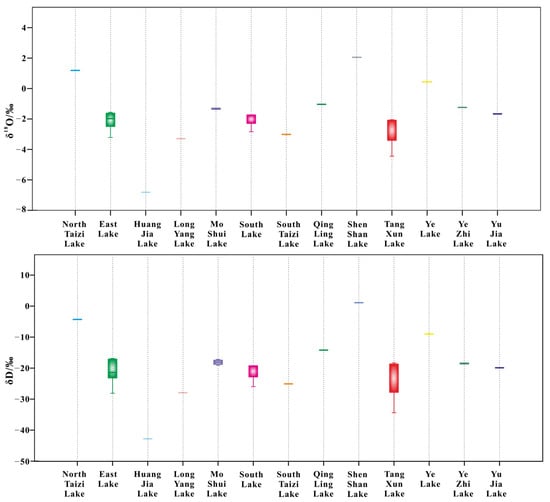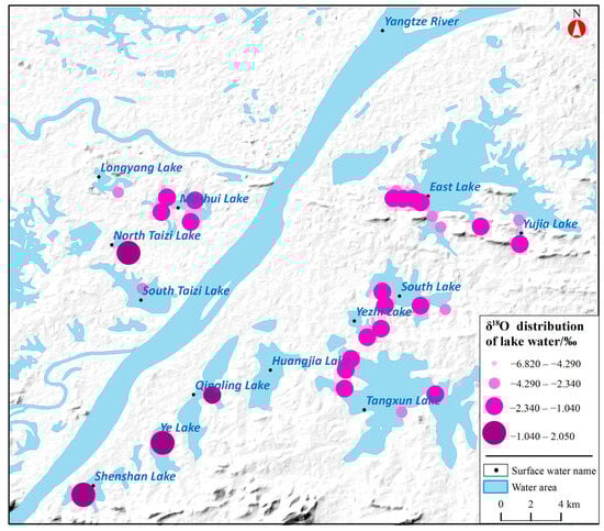 (2) The lake water line equation was δD = 5.05δ18O − 10.3, and the correlation coefficient was 0.97. Compared with the LMWL in Wuhan, the slope and intercept had obvious deviations, both of which were significantly smaller, indicating that the lakes in Wuhan were local small water circulation systems, and the evaporation and enrichment of hydrogen and oxygen isotopes in the water bodies were more obvious. This phenomenon was consistent with the discovery [] that the isotope δ18O and δD values of lake water in the middle and lower reaches of the Yangtze River were significantly higher than those of the Yangtze River water.