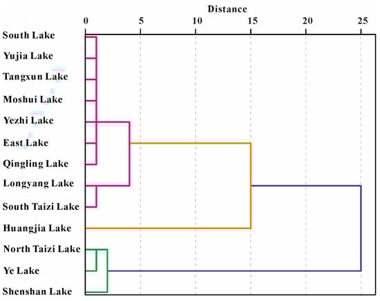 Cluster analysis of lakes in Wuhan based on δ18O and δD values. The abscissa “distance” represents the distance between the two sample categories, which is dimensionless. The color of a line represents the category the sample is divided into, and different colors represent different categories.