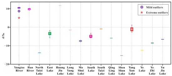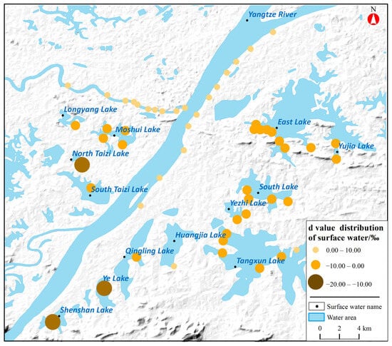 The d value of deuterium excess in atmospheric precipitation can directly measure the degree of unbalanced fractionation of hydrogen and oxygen isotopes in the process of evaporation and condensation of atmospheric precipitation in this area. The d value in surface water can directly reflect the degree of evaporation and enrichment of water bodies and the recharge source between water bodies [,]. The characteristics of deuterium excess parameter values of surface water in the Wuhan area are shown in Figure 11 and Figure 12. The deuterium excess parameter values can be divided into three intervals, i.e., 10~0‰, 0~−10‰, and −10~−20‰. The d values of the Yangtze River and the Hanjiang River were positive, and the d values of the lake water were mainly negative. The d value of the lake water was significantly smaller than that of the river water, which was consistent with the findings of Yuan et al. [] and Wu et al. [] who conducted isotope investigations of lake water in the Qinghai-Tibet Plateau and Qinghai Lake. It was found that the d value in the lake water was negative. The d value of the Yangtze River water samples mainly ranged from 10.16‰ to 10.72‰, with an average of 10.58‰, and there were two abnormal values in the sample data. The d value of the Hanjiang River water samples mainly ranged from 9.08‰ to 10.24‰, with an average of 9.79‰. The d value of lake water mainly ranged from −15.3‰ to 11.76‰, with an average of −4.43‰. Lakes can be divided into two types according to the d value: (i) IFD lakes with d values ranging from −10 to −20‰. These lakes were mainly North Taizi Lake, Shenshan Lake, and Ye Lake; (ii) OFE lakes with d values ranging from 10‰ to −10‰. These lakes were mainly Huangjia Lake, East Lake, Tangxun Lake, etc., consistent with the above cluster analysis results. At the same time, there was little fluctuation in the d values of the OFE lakes, and most of them were concentrated in the range of 0~−10‰, indicating that the difference between the δ18O and δD fractionation rates of the outflow ecotype lakes in different areas was slight. It was not affected by factors such as rainfall and height and conformed to the law of the water cycle.