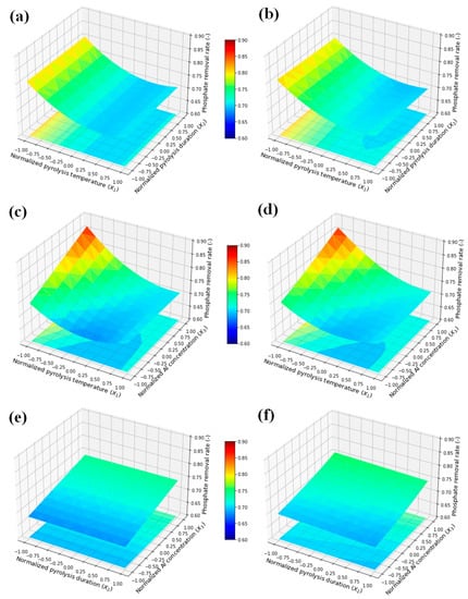 where Y is the phosphate removal rate predicted using the QE (−); a0 is the constant coefficient; ai and ai,j are the parametric coefficients; and X1, X2, and X3 are the normalized pyrolysis temperature and duration and Al concentration, respectively.