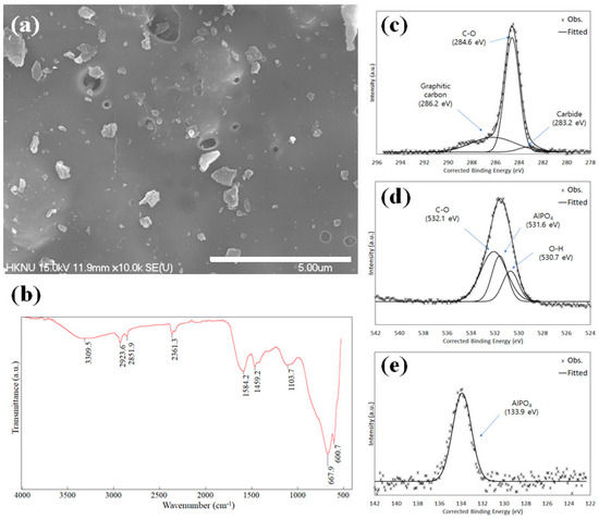 FE-SEM image (a) and FTIR spectrum of Opt-AL–FWB (b) and XPS spectra of phosphate-adsorbed Opt-AL–FWB: C 1s (c), O 1s (d), and P 2p (e).