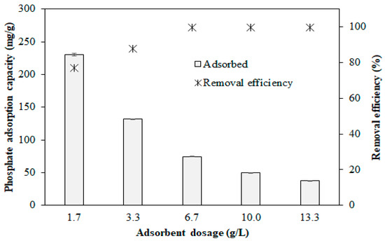 The results of the dosage studies are shown in Figure 3. The experimental results show that the phosphate removal efficiency increases from 76.8% to 99.6% as the adsorbent dosage increases from 1.7 to 6.7 g/L, whereas the phosphate adsorption capacity decreases from 230.5 to 74.7 mg/g. No significant increase in the removal efficiency is observed at dosages of >6.7 g/L, and the phosphate adsorption capacity is also inversely proportional to the dosage when the dosage is >6.7 g/L. The decrease in the phosphate adsorption capacity with increasing adsorbent dosage may be attributed to the presence of unsaturated active sites [65].