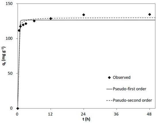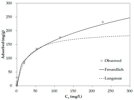 The results of the kinetic studies were analyzed using pseudo-first-order and pseudo-second-order models (Equations (S3) and (S4)), and those of the equilibrium studies were analyzed using the Langmuir and Freundlich models (Equations (S5) and (S6)). The thermodynamic parameters were calculated using Equations (S7)–(S9), and all model parameters were estimated via nonlinear regression using the dynamic fit Wizard function in SigmaPlot 10.0 (IBM, Armonk, NY, USA).