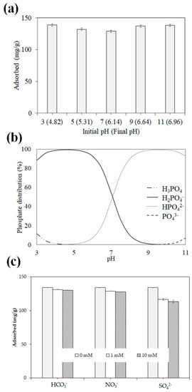 The results of the pH studies and the phosphate species distributions predicted using Visual MINTEQ are shown in Figure 7a,b. At pH 3–11, the adsorption capacity is 129.0–138.7 mg/g with no drastic difference. When the solution pH is lower than the zero-charge pH of the modified AL–FWB, the biochar surface is positively charged [80]. However, phosphate mostly occurs as a neutral species (H3PO4) at pH 2.12, and thus, predicting phosphate adsorption via electrostatic attraction at very low pH values (<2.12) is challenging. However, as phosphate mostly occurs as H2PO4– at pH 3–7, the adsorption capacity is partially improved as the pH is lowered within this range, which is attributed to the enhancement of adsorption via electrostatic attraction. Nevertheless, the major species of phosphate vary depending on the pH, and the adsorption capacity is constant even at pH 11 when the surface charge should be negative, indicating that electrostatic attraction is not the main adsorption mechanism. Instead, ligand exchange between phosphate (H2PO4–, HPO42–, and PO43–) and Al–OH or Al–O appears to be the main mechanism [42], which is consistent with the adsorption mechanism described above.