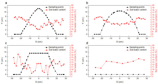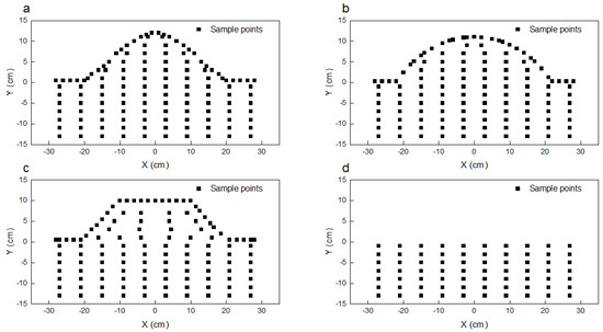 After the soil tank was filled, under the condition that the Mariotte bottle did not leak and the distilled water was sufficient, the Mariotte bottle was connected to the water supply pipe at the bottom of the organic glass soil tank with a rubber hose to maintain a fixed water head to form a fixed water supply condition. When the water level of the soil tank reached the highest point of the ridge, the water supply was stopped, and the soil tank was placed indoors without direct sunlight to create a natural evaporation condition. The experimental soil samples were collected 90 days after the end of the water supply, and soil samples were taken every 2 cm of soil with a depth of 1 cm along the surface to study the distribution of salt along the ridge surface, where the sampling volume was 2 × 10 × 1 cm3. The sampling volume of the 2 < d ≤ 16 cm depth profile soil was 5 × 10 × 2 cm3. Samples were collected with a sharp soil dressing knife to a given size, where the center coordinate of each soil sample was recorded as the sample coordinate. The sample point coordinates were drawn in a two-dimensional Cartesian coordinate system and are shown in Figure 1. The soil water content was determined immediately after sampling, and the rest of the samples were placed in a ziplock bag after drying, grinding, and passing through a 2 mm sieve for testing.
