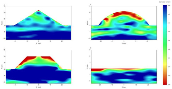 Spatial distribution of water content in the soil profile under different treatments, where (a–d) represents T1, T2, T3, and CK, respectively.