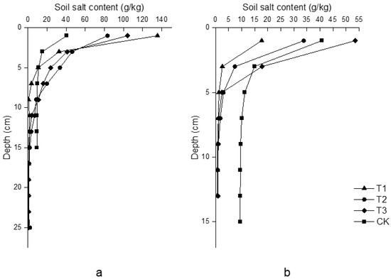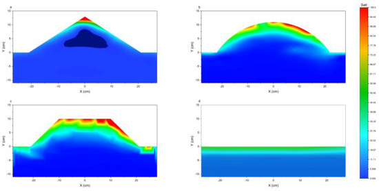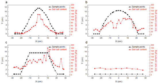 Spatial salt distribution in the soil profile with different treatments, where (a–d) represents T1, T2, T3, and CK, respectively.
