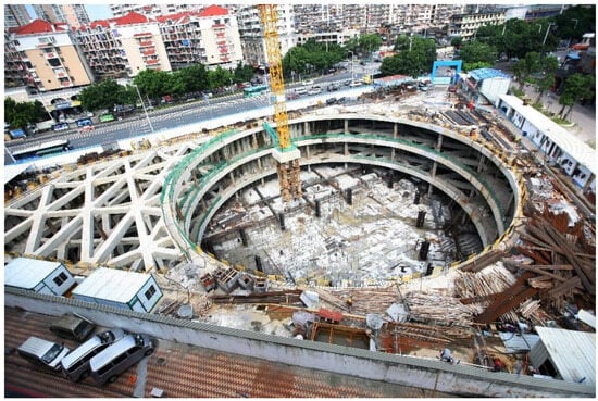 Fuzhou is located in the southeastern coastal area of China, as shown in Figure 1, and it is the capital city of Fujian Province. The Taijiang Square project is situated at the southeastern corner of the intersection between Wuyi South Road and Yingzhou Road in Fuzhou, as shown in Figure 2. The development plan comprises a 36-story mixed-use commercial and office tower, as well as a 5-story commercial podium. The height of the mixed-use tower above ground level is approximately 130 m, while the commercial podium stands at 22.5 m. The upper structure of the mixed-use tower is proposed to be a framed tube system, with individual columns capable of withstanding a maximum load of 45,000 kN. The upper structure of the commercial podium is designed as a framed system, with individual columns capable of supporting a maximum load of 10,000 kN. The project includes three basement levels, with each level having a clear height of 4.8 m, 5.3 m, and 5.3 m from top to bottom. The site elevation is 6.90 m, and the floor slab is buried at a depth of approximately 20 m below the designed outdoor ground level, with an elevation of −13.10 m.