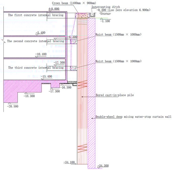 Based on the analysis of the surroundings of the foundation pit, the foundation pit is supported by cast-in-place piling and internal bracing. To reduce the impact on ground traffic and to control the deformation of the surrounding ground, the piles on the east side of the foundation pit near the plant are 1.1 m in diameter, 1.4 m in spacing, and 33 m long, and the piles in the remaining locations are 1.0 m in diameter, 1.3 m in spacing, and 32 m long. To ensure the water retention effect and reduce the impact of precipitation on the surrounding environment, in this foundation pit project, an 800 mm thick double-wheel deep-mixing water-stopping curtain wall is used on the outside of the enclosure pile to retain water; the curtain wall’s depth is 34 m. The profile view of the supporting structure is shown in Figure 3.