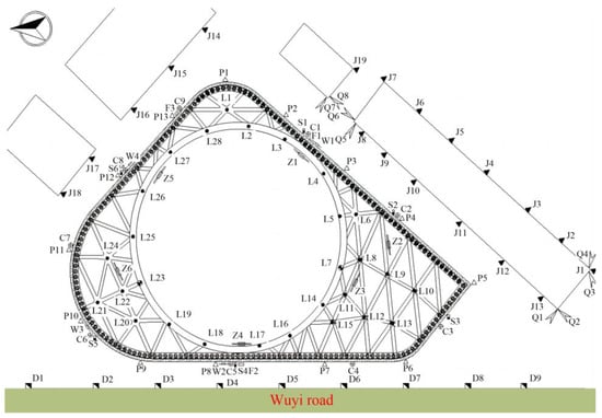 Given the extensive excavation area, considerable depth, and complex geological conditions of this foundation pit project, the selection of monitoring items should be based on careful consideration of the engineering and hydrogeological conditions, pit classification, characteristics of the support structure, and deformation control requirements. In addition to conventional inspection through visual inspection and inspection with the aid of other tools, the main instrumentation monitoring items are as follows: (1) the monitoring of the deep horizontal displacement of the enclosure pile; (2) the monitoring of the horizontal displacement at the top of foundation pit; (3) the monitoring of the settlement at the top of the foundation pit; (4) the monitoring of the axial force of the internal bracing; (5) the monitoring of the axial force of the enclosure pile; (6) the monitoring of the settlement of the column; (7) the monitoring of the groundwater level; (8) the monitoring of the layered settlement of the soil; (9) the monitoring of the settlement of the surrounding buildings; (10) the monitoring of the horizontal displacement of the surrounding buildings; (11) the monitoring of the tilt of the surrounding buildings; and (12) the monitoring of settlement of the surrounding surface and underground pipelines. The plan layout of the foundation pit monitoring points is shown in Figure 4, and the number of monitoring points, monitoring methods, and instrument names are shown in Table 3.