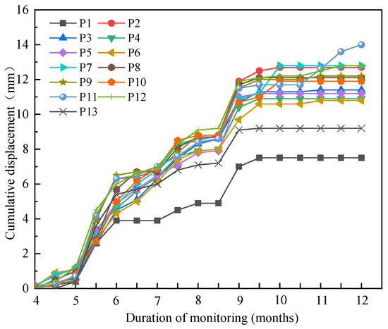 It can be seen from Figure 5 that, among the 13 monitoring points, the point with the largest cumulative horizontal displacement was the monitoring point P11, with a cumulative displacement of 14.0 mm. The point with the smallest cumulative horizontal displacement was the monitoring point P1, with a displacement of 7.5 mm. It can also be seen from Figure 5 that when the earthwork of the foundation pit was excavated, the horizontal displacement at the top of the foundation pit gradually increased with the increase in the excavation depth. The displacement accumulation and displacement increase rate of each monitoring point in the excavation process did not exceed the design alarm value. During the construction of the basement floor and shear walls after the completion of earth excavation, the horizontal displacement at the top of the foundation pit did not increase significantly, and the horizontal deformation at the top of the foundation pit tended to be stable. During the entire earthwork excavation and foundation construction process of the foundation pit, the accumulated horizontal displacement value and deformation rate at the top of the foundation pit did not exceed the design alarm value, thus meeting the requirements of the design and specifications.