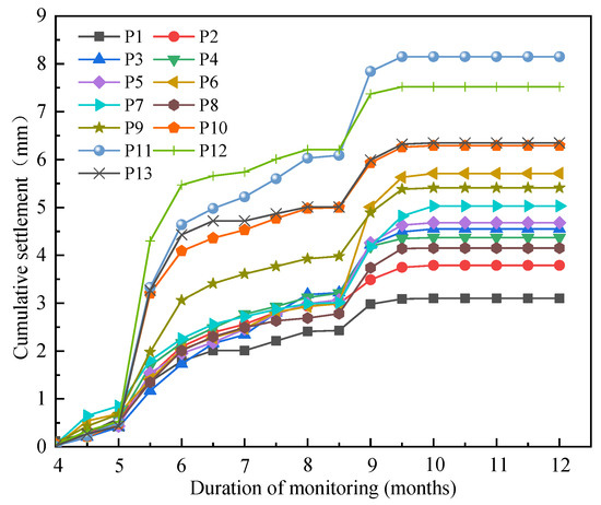 At the top of the slope, 13 settlement monitoring points were arranged along the periphery, numbered P1to P13. The observation mark was driven into the top of the crown beam with a measuring nail. Levels were used to monitor these 13 points at the top of the foundation pit. The monitoring results are shown in Figure 6.