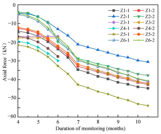 As shown in Figure 7, the Z3 and Z4 monitoring points on the first reinforced concrete internal bracing had no monitoring data after the third month, which is mainly because the Z3 and Z4 monitoring points were destroyed during the construction process in the third month. From the variation curves of the Z1, Z2, Z5, and Z6 monitoring points, it can be seen that, before the 7th month, the axial force value of the first reinforced concrete internal bracing gradually increased with the excavation depth of the foundation pit, and the increase rate was faster. After the 7th month, when the construction of the shear wall began after the excavation of the foundation pit, the axial force of the first reinforced concrete internal bracing also increased gradually, but the increase rate slowed down noticeably. In the process of monitoring, the axial force of the first reinforced concrete internal bracing did not exceed the alarm value, thus meeting the design requirements.