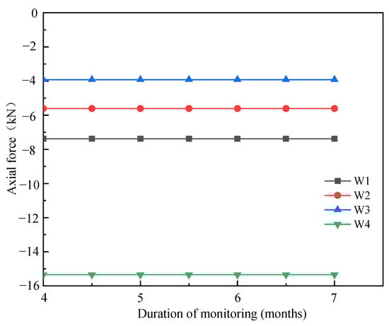 A total of four monitoring points were arranged on the enclosure pile, numbered W1 to W4. A rebar axial dynamometer was arranged at each point, and the layout method was welding the rebar axial dynamometer in series with the main reinforcement of the enclosure pile. The monitoring results are shown in Figure 8.